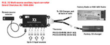 P.I.E. Multi-source auxiliary input converter. The new PIE X-3 Auxiliary Input Converter system allows the user to add up to three auxiliary input sources and have them connected directly between the CD changer and factory radio. You can connect your MP3 portable player, an XM radio, an iPod, or any combination of three separate audio sources, all at the same time AND still use your OEM or aftermarket CD Changer! The X-3 system interrupts the audio of the CD changer, switching between the three user-selectable RCA level auxiliary audio sources, and defaults back to the CD changer if desired. The X-3 system consists of two parts, the Selector Brain Module or X-3, and the vehicle-specific T-harness sold separately.
