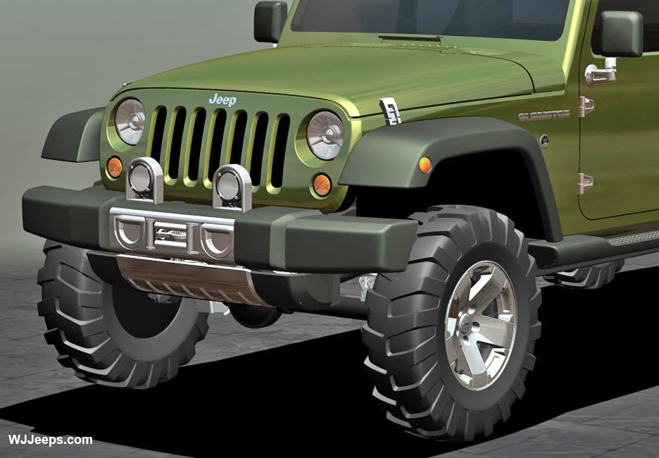 One of the two new Jeep concepts unveiled at the 2005 Detroit auto show January 9th was the Gladiator. Named after a 1960s Jeep pickup truck, the Gladiator is categorized as a mid-sized "Flexible Utility Truck". The Gladiator features a 2.8-liter common rail turbo-diesel engine with 163 HP and 295 lb-ft of torque and is mated to a 5-speed manual gearbox. Other features include a rear seat access hatch on the driver's side, a peel-back canvas roof, drop-down rear glass and 13.7" of ground clearance. The unique bed expands from 5-6" to 6-8", accomplished by a rear seat that slides beneath the bed with the entire rear bulkhead sliding forward into the cab along rails.