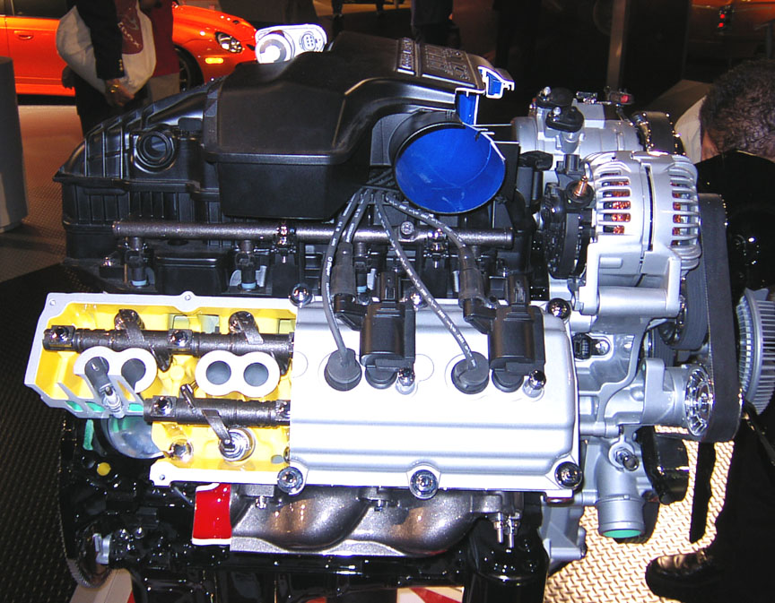 Hydraulic end-pivot roller rockers Flash-chromed stems, hardened tips 1.89" diameter intake Chain-driven SOHC, 16 valves, hydraulic end-pivot roller rockers 53021159AA (left, 1999-2002) 53021159AC (left, 2003-2004) Cross drilled, radiused, hardened, microfinished, fully counterbalanced, 5 main bearings 2.5" diameter crossdrilled main journals, rolled fillets 2.0" rod journals, rolled fillets Balance: > 18 gm/cm P/N 53021409AA Aluminum alloy heads Near hemispherical combustion chambers Detonation sensor bosses in the valley
