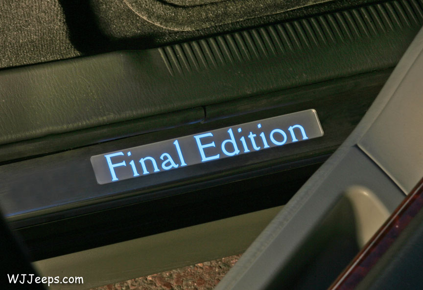 Released for sale on October 16, 2004, the Grand Cherokee Final Edition features a 5-cylinder 2.7-L CRD engine with 163 HP and 400 NM torque. A chrome package is also standard featuring a custom chrome grille inset with lower fascia chrome accent, chrome rear side window trim, chrome strip above the license plate, chrome-plated rear bumper cover and "Final Edition" entrance sills that light up. Other features include floor mats with the "Final Edition" logo, the UConnect hands-free phone system and the rear Park Pilot system. Production is being limited to 1,200 vehicles. The special pricing for the Final Edition models was set at 48,700 euro ($65,950 US), a savings of 2,750 euro ($3,725 US).