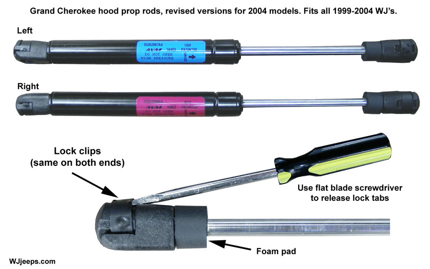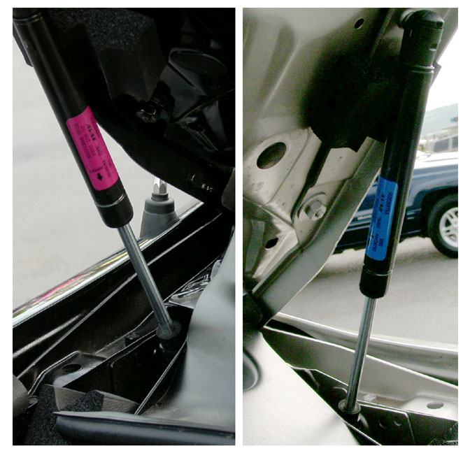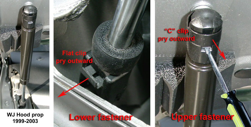 1. Raise and securely support hood. Rather than trying to find a stick the exact size it's easier just to have someone help you as the props can be changed rather quickly. 2. With a flat-blade screwdriver pry the lower metal retaining clip outward. It does not need to completely come off. Be careful not to let it drop somewhere where you'll never find it. 3. Pry off the spring clip retainer attaching the support prop upper stud. 4. Lift up slightly on the hood and disconnect prop from lower ball stud. 5. Rotate prop upwards to disconnect it from the upper ball stud. 6. Install replacement prop, making sure the clips are secure. Carefully lower and raise hood to test. |