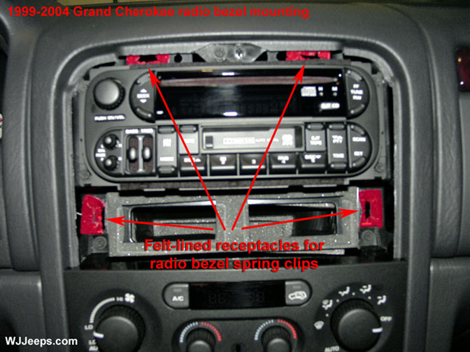 The radio bezel is a one-piece unit that includes the center air vent grilles. The bezel is held in place with 4 spring clips. With a wide flat tool (a 3" plastic spackle tool works great), gently pry on each vertical side and carefully pull the bezel out a little at a time until it is free. The red areas in the center picture are the felt-lined receptacles that the bezel spring clips fit in to, which shows the general area of where to pry when removing the bezel.