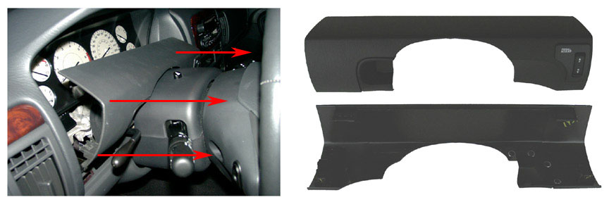 Shown above left is the black lower center bezel, front and back (with power outlet and seat switches not installed). Above right, the new style with a cubby hole instead of the ashtray that debuted on the 2003 models. The bezel is attached to the instrument panel with four spring clips.