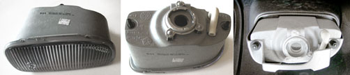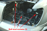 Open the hood, and using a 7mm socket remove the long headlamp jackscrew, located as shown in the photo above, 2nd from left. Grasp the headlight assembly on the upper inboard and lower outboard corners and wiggle and pull very firmly outward to disengage the 3 ball stud alignment posts from their sockets (be cautious of the sharp edges of the grille and fender areas surrounding the headlamp). The location of the 3 mounting sockets and ball studs is shown in the photos below. Note: Use caution when removing and handling the headlamp assembly. The headlamp beam adjustment shaft on the rear center of the housing is very brittle and can easily be broken. Tip: Apply a small amount of grease to the 3 alignment posts when reinstalling the headlamp housing, this will make it easier to remove in the future.