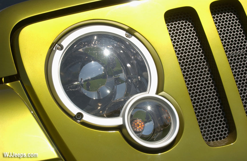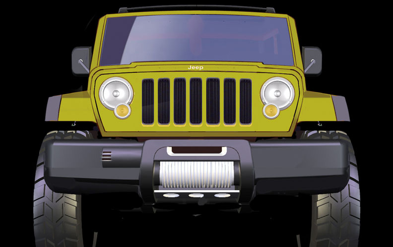 The classic Jeep design elements – the seven slot grille, large “eye” headlamps and the prominent windshield presence – are freshly nuanced and then enhanced by a purposeful lower-front bumper with rugged, oversized tow hooks, slightly exposed front suspension componentry and bolt-on fenders.