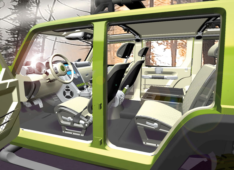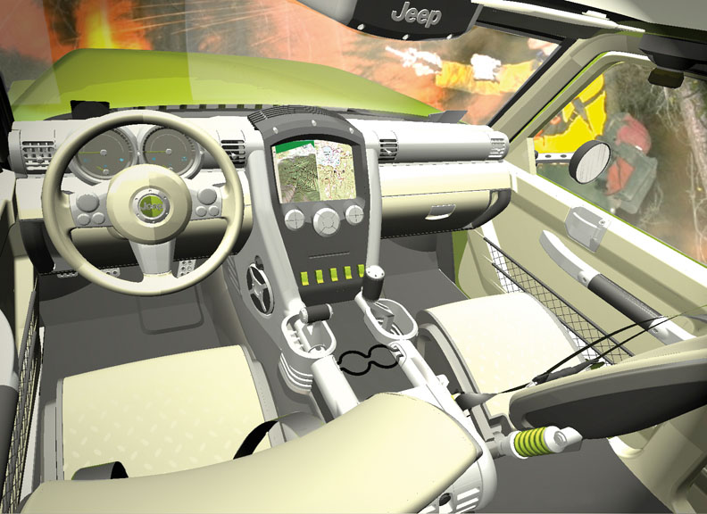 An advanced drive-by-wire system provides a fascinating functional detail to the Treo interior, which in turn allows for instant adaptability for either left- or right-hand drive. The steering column, pedals and instrumentation are all contained in one module – a single piece of sculpture that can be easily slid to either side of the car – which mounts to a one-piece structural beam (a second module contains the radio, GPS and HVAC controls in a touch screen that is removable). This unique functional design feature, combined with the added visibility provided by the Jeep see-through grille and its creative greenhouse design, contribute to the Treo’s roomy, airy interior – allowing it to take full advantage of natural and ambient light sources.