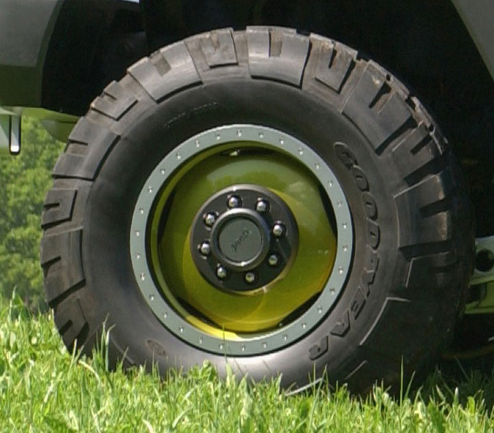 Featuring all-new body-on-frame construction with hydroformed frame rails and riding on an 80-inch wide chassis with 123-inch wheelbase and 37-inch tires, the Jeep Rescue is built for anything thrown its way. The front hydropneumatic suspension combines with the heavy-duty link-coil rear suspension to give the Rescue its solid footing on all terrain. The suspension has adjustable ride height and an additional 4-inch lift available for fording. The aforementioned 37-inch tires feature an MTR tread and run-flat capability, negating the need for a spare. On-board tire pressure control has the ability to “tune” tire pressures for maximum traction on all surfaces.