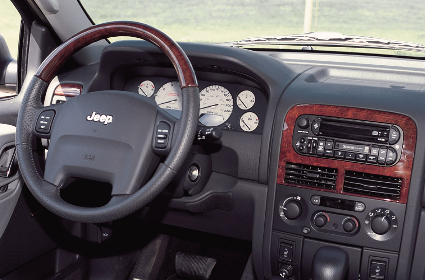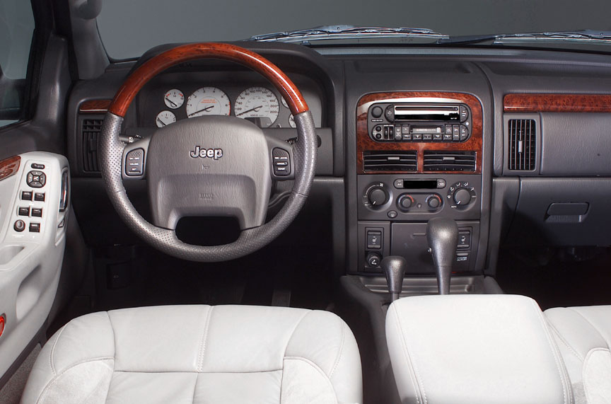 The only interior color combinations available for all Overland models were combinations of Dark Slate gray and Light Slate Gray. For 2002-2003, the light gray seats were leather with suede accents. These were restyled 2004, as shown in the pictures above. Some people have really liked these interiors while others have not. One Grand Cherokee owner who wanted the rest of the Overland features but did not care for the seats was able to work out a special trade-out with his dealer at the time of original purchase. The dark gray seats from a brand new Limited, along with the matching door panels and console lid, were swapped into a new Overland. The dealer placed the Limited with the Overland interior back into his showroom, with a $1,000 premium. They charged the Overland buyer a very reasonable one hour of labor to make the switch.