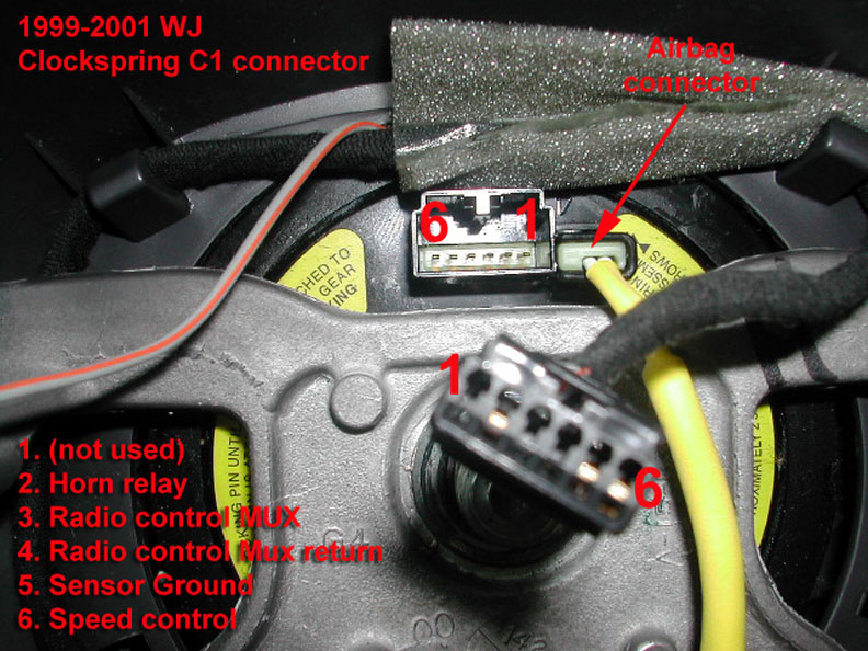 C. Steering wheel wiring harness(es) - 1999-2001 model Grand Cherokees use one type of harness while 2002-2004 models use a second type. The 1999-2001 steering wheel harness is very expensive. However, it's possible to use the much cheaper 2002-up harness on 1999-2001 WJ's. The existing factory harness that is used for the cruise control switches and horn is left in place, while the new harness is added for the remote radio switch connections. The new harness will plug in to both radio switches, and on the other end of the harness the two wire spades are removed from the connector end. These two wires are then installed into the end of the 6-way factory connector that goes to the clockspring, as shown in the diagram below.