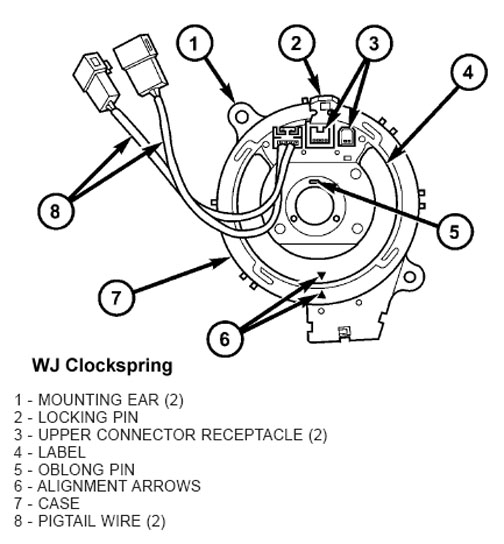 wheel. On the Grand Cherokee WJ the rotating electrical components include the driver airbag, the horn switch, the speed control switches, and the remote radio switches, if the vehicle is so equipped. The clockspring case is positioned and secured to the multi-function switch mounting housing near the top of the steering column. The connector receptacles on the tail of the fixed clockspring case connects the clockspring to the vehicle electrical system through two take outs with connectors from the instrument panel wire harness.