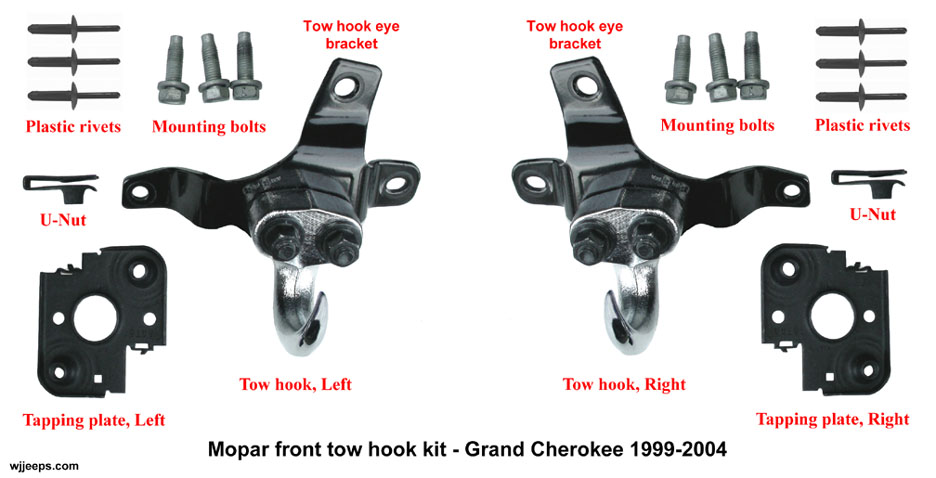 | Kits | Part # | MSRP | Mopar front tow hook kit, black (5,000-lb capacity, two hooks with brackets, six M10x1.25x40 bolts, 2 U-nuts, 2 tapping plates, 6 plastic wheelwell rivets) | 82207552AB | $111.00 |