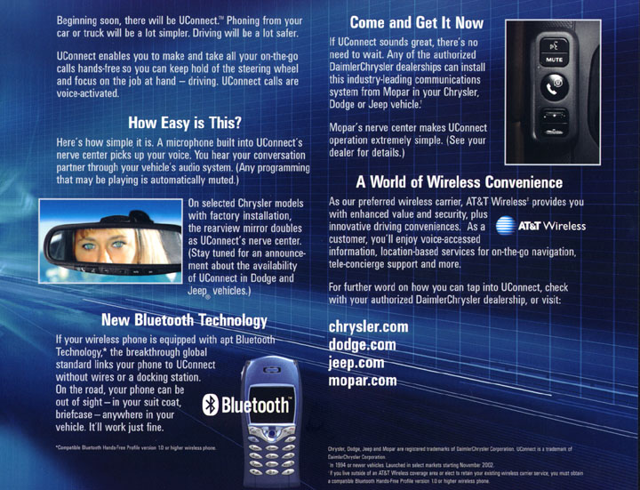 UConnect enables you to make and take all of your on-the-go calls hands-free so you can keep hold of the steering wheel and focus on the job at hand - driving. UConnect calls are voice-activated. A microphone built into UConnect's nerve center picks up your voice. In the factory installed systems, you hear your conversation partner through the vehicle's audio system (any programming that may be playing is automatically muted.) Another feature, if you are talking on the phone as you walk to your car for example, UConnect automatically switches your call to the automobile's hands-free system upon starting the car. Chrysler Group turned to Peiker Acoustic, Inc., a supplier of high-quality communication products in both Europe and North America, to provide the hands-free system for UConnect. Peiker's hands-free system consists of a control pad, speaker, microphone, wiring harness and a control module containing voice recognition software and the Bluetooth chipset. Mopar also plans to offer UConnect in the future to customers of past model year Chrysler Group vehicles. Available starting October 2002 as a dealer installed option. (Part # 82207853 $299.99 MSRP + install). Available as a factory installed option starting with 2005 Grand Cherokee models. UConnect features: