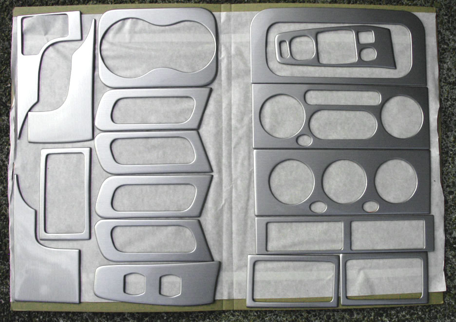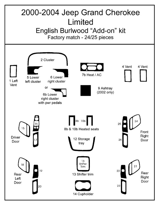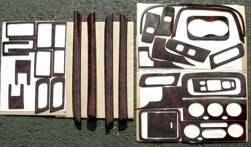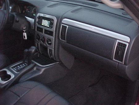 PRICE: ($U.S.)* (discontinued) 1. Laredo deluxe 33-piece "Cover-up kit": Available in all 13 colors/styles. $349.50 including shipping (Kit MSRP $535.00) 2. Limited deluxe 36-piece "Cover-up kit": Available in all 13 colors/styles. $379.50 including shipping (Kit MSRP $579.00) 3. Limited 2000-2004 English Burlwood 24/25-piece "Add-on" kit: $319.50 including UPS Ground shipping (continental U.S.). This kit is designed to be used for ADDING Burlwood trim to compliment the existing factory Burlwood trim featured on all 2000-2004 Limited models. Includes all of the trim pieces from the Burlwood full kit except for the pieces that are already included on Limited models from the factory. Standard delivery, 7-10 business days. Expedited delivery available (3-5 business days), inquire for price & provide zip code. 4. Limited/Overland 1999-2004 11/12-piece cover-up kit: Available in all 11 colors/styles. $265.00 including UPS Ground shipping (continental U.S.). This kit covers up just the original factory pieces, covering all of them with any of the 11 available colors/styles. Includes 4 door trim strips, 2 front dash strips, radio trim, digital AC control trim and heated seats (+ ashtray 1999-2002). Standard delivery, 7-10 business days. Expedited delivery available (3-5 business days), inquire for price & provide zip code. *Note: There was a $90 surcharge for Chrome colored kits