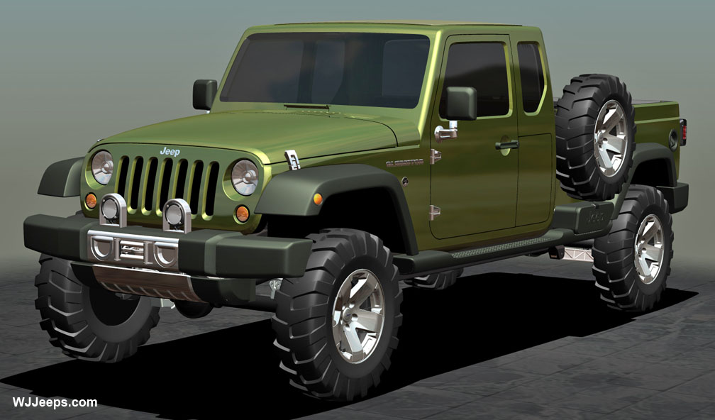 One of the two new Jeep concepts unveiled at the 2005 Detroit auto show January 9th was the Gladiator. Named after a 1960s Jeep pickup truck, the Gladiator is categorized as a mid-sized "Flexible Utility Truck". The Gladiator features a 2.8-liter common rail turbo-diesel engine with 163 HP and 295 lb-ft of torque and is mated to a 5-speed manual gearbox. Other features include a rear seat access hatch on the driver's side, a peel-back canvas roof, drop-down rear glass and 13.7" of ground clearance. The unique bed expands from 5-6" to 6-8", accomplished by a rear seat that slides beneath the bed with the entire rear bulkhead sliding forward into the cab along rails.