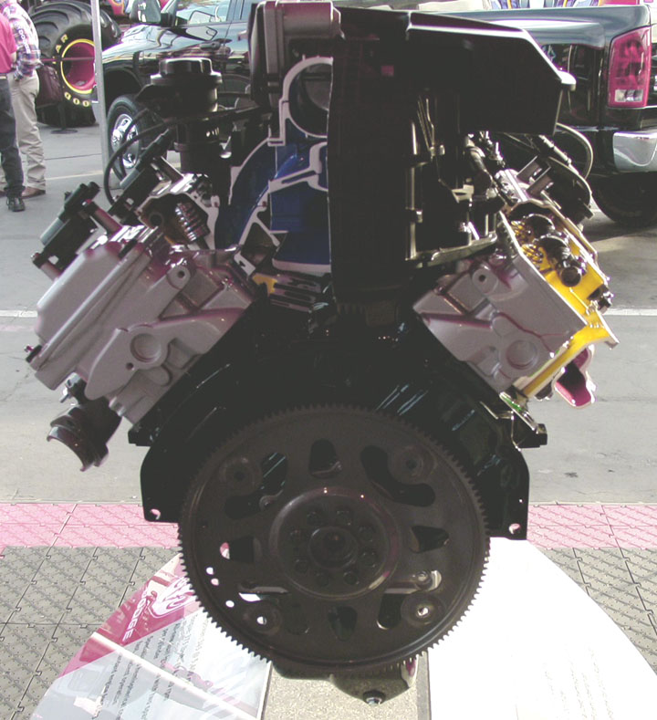 Hydraulic end-pivot roller rockers Flash-chromed stems, hardened tips 1.89" diameter intake Chain-driven SOHC, 16 valves, hydraulic end-pivot roller rockers 53021159AA (left, 1999-2002) 53021159AC (left, 2003-2004) Cross drilled, radiused, hardened, microfinished, fully counterbalanced, 5 main bearings 2.5" diameter crossdrilled main journals, rolled fillets 2.0" rod journals, rolled fillets Balance: > 18 gm/cm P/N 53021409AA Aluminum alloy heads Near hemispherical combustion chambers Detonation sensor bosses in the valley