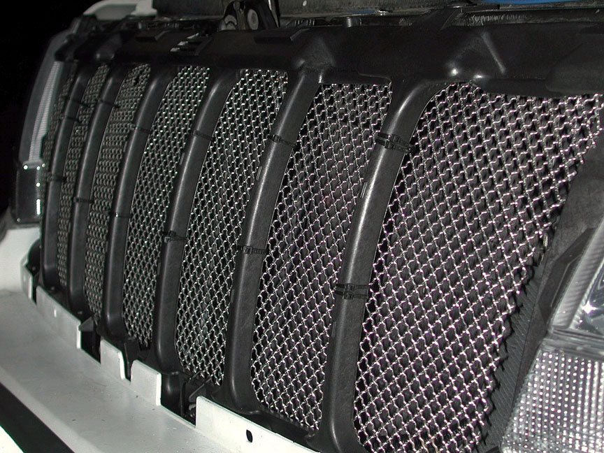 2. Stull Industries diamond wire grille insert shown installed on a 2004 Overland grille. This is actually a 2002 Limited with a 2004 grille upgrade, owned by Jeep Unlimited member LowriderWJ. Due to the new grille design for 2004, the insert is attached to the headlamp mounting module. The installation on 2004 models is very easy, as the grille is held on by clips and can be easily removed without removing the fascia.