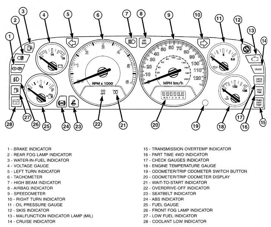 Cluster illumination (#103 Jeep P/N L00PC121 for backlighting and # PC74, Jeep P/N L000PC74 for warning/status lights)