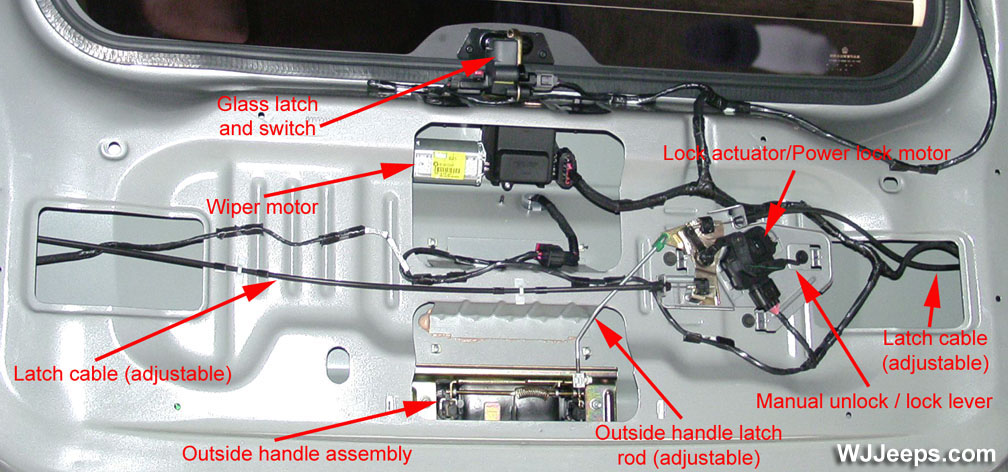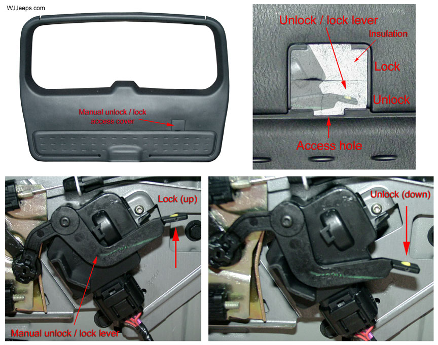 All WJs feature an emergency unlock/lock switch lever for the liftgate. Should the liftgate become locked and unable to be opened due to a switch or circuit failure, a manual unlock/lock lever is accessible behind a small panel on the interior trim panel. As shown in the photos above, the lever can be moved up or down to unlock or lock the liftgate door.