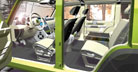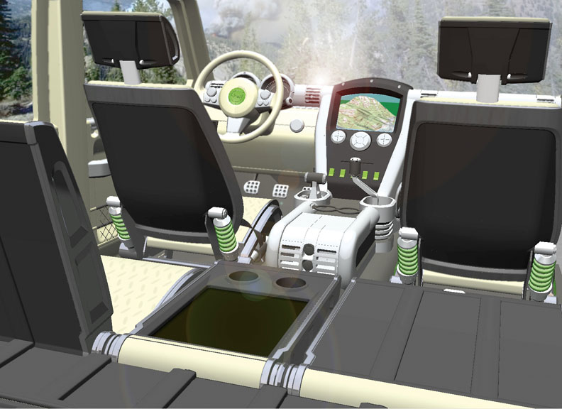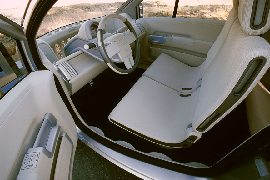 An advanced drive-by-wire system provides a fascinating functional detail to the Treo interior, which in turn allows for instant adaptability for either left- or right-hand drive. The steering column, pedals and instrumentation are all contained in one module – a single piece of sculpture that can be easily slid to either side of the car – which mounts to a one-piece structural beam (a second module contains the radio, GPS and HVAC controls in a touch screen that is removable). This unique functional design feature, combined with the added visibility provided by the Jeep see-through grille and its creative greenhouse design, contribute to the Treo’s roomy, airy interior – allowing it to take full advantage of natural and ambient light sources.