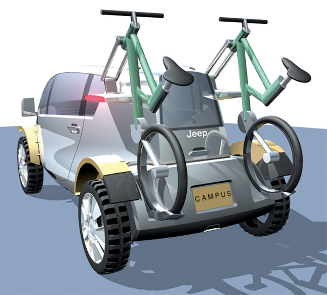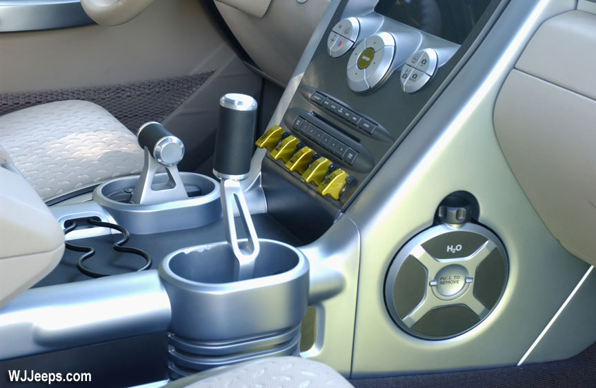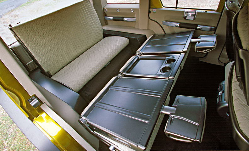 The overall effect of the Treo interior is one of spaciousness and usability. Future-tech materials mesh with tactile textures and surfaces, which results in an interior environment that’s bright, open and functional. The Treo’s rear seat can be folded to store more gear, although the front wheels from the exterior-mounted Jeep Rubicon bikes can be stored in the back without disturbing the rear passenger.