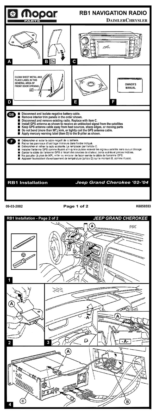 The RB1 Navigation Radio is designed to install directly into any 2002-2004 model Jeep Grand Cherokee, utilizing the existing factory wiring harnesses. It can also be installed into earlier models using a special radio harness adaptor cable. All steering wheel controls for the radio are retained, and while in the NAV mode these buttons will operate selected navigation functions. The RB1 will also operate the factory 10-disc CD changer if so equipped. The small flat antenna for the NAV system also needs to be mounted, under the dash behind the instrument cluster. It comes attached to a metal bracket and mounts with a peel 'n stick adhesive strip.