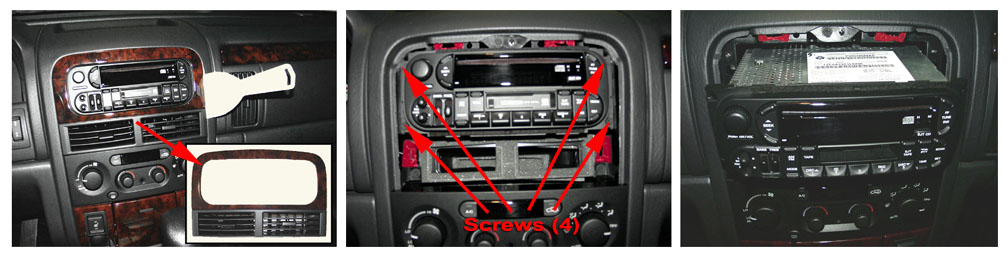 2. Remove radio trim cover bezel, as shown in the photo sequence above. The radio and vent trim bezel is one piece and is held in place with 4 spring clips. With a wide flat tool or trim stick (a 3" plastic spackle tool works great), gently pry on the lower left and lower right sides (along the air vents) and carefully pull the bezel out a little at a time until the bottom is free. Pry at the upper left and right sides to free the top clips. The four red areas seen in the center picture are the felt-lined receptacles that the bezel spring clips snugly fit into. This shows the general area of where to pry when removing the bezel.