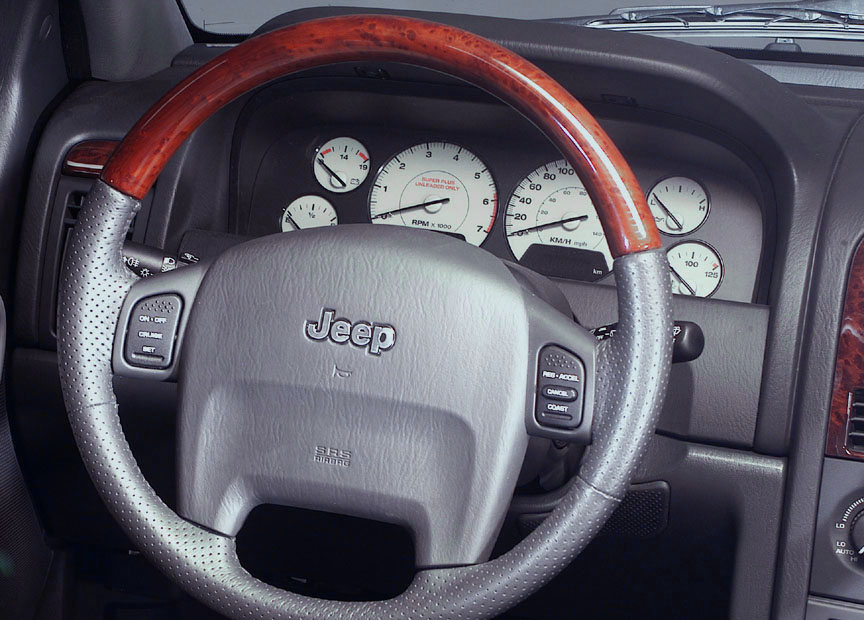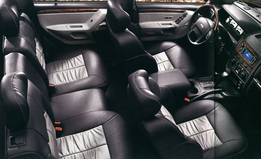 The only interior color combinations available for all Overland models were combinations of Dark Slate gray and Light Slate Gray. For 2002-2003, the light gray seats were leather with suede accents. These were restyled 2004, as shown in the pictures above. Some people have really liked these interiors while others have not. One Grand Cherokee owner who wanted the rest of the Overland features but did not care for the seats was able to work out a special trade-out with his dealer at the time of original purchase. The dark gray seats from a brand new Limited, along with the matching door panels and console lid, were swapped into a new Overland. The dealer placed the Limited with the Overland interior back into his showroom, with a $1,000 premium. They charged the Overland buyer a very reasonable one hour of labor to make the switch.