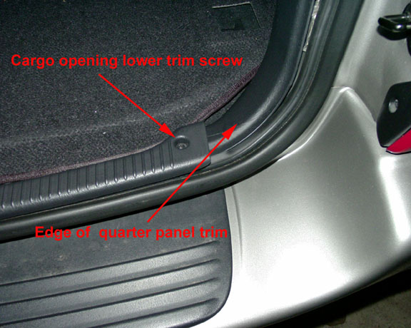 3. Remove the phillips screw on the right side of the lower liftgate opening trim piece. This will allow the quarter panel trim to be pulled out from under the trim piece.