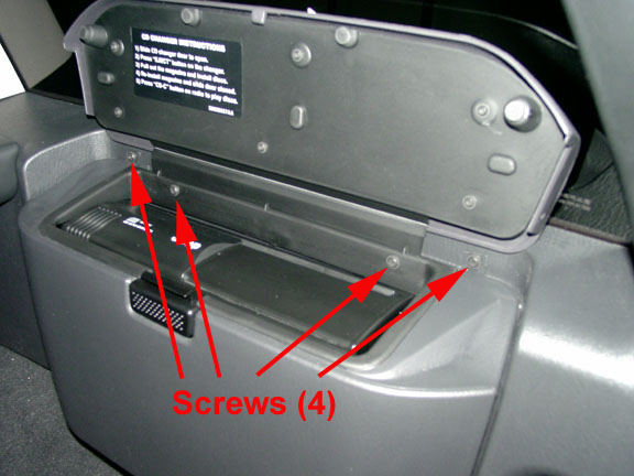 1. If equipped, remove the CD changer housing and CD changer. Open the changer lid and remove the four phillips head screws that run along the top edge of the compartment hinge. Lift compartment housing straight up an inch or so until it stops and then pull straight out to remove. Disconnect the wire harness connector on the left side of the changer unit. Remove the four metal bracket nuts with a 10mm deep socket. The changer unit with its bracket attached can now be removed.