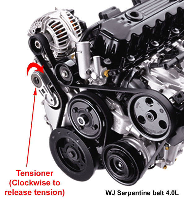 2. Using a 15mm socket wrench (1/2" drive breaker bar or ratchet for the 4.0), rotate belt tensioner clockwise until it contacts its stop. Remove belt, then slowly rotate the tensioner into the freearm stop position.