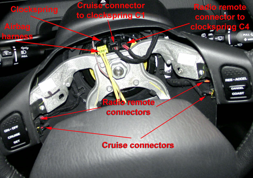 Replace the existing base harness with the 2002-2004 premium harness (P/N 56042934AA, MSRP $149.99). This harness will plug directly into the clockspring and into the cruise and radio switches without any modifications.