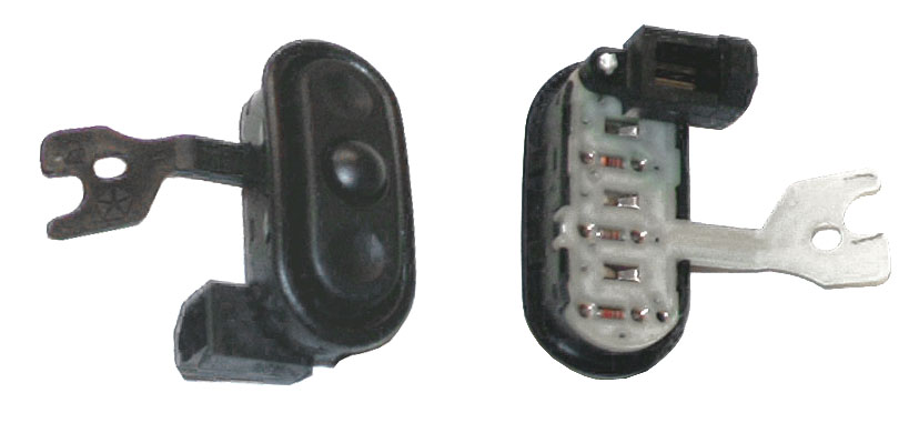 5. Once the holes have been cut, install the radio switches so they are firmly seated in the mounting hole and that the plastic "arms" are lined up into their guideposts. If the switches mount loosely you can secure them from the inside with some hot glue, or add some electrical tape to the perimeter of the switch to make it fit the hole tighter.