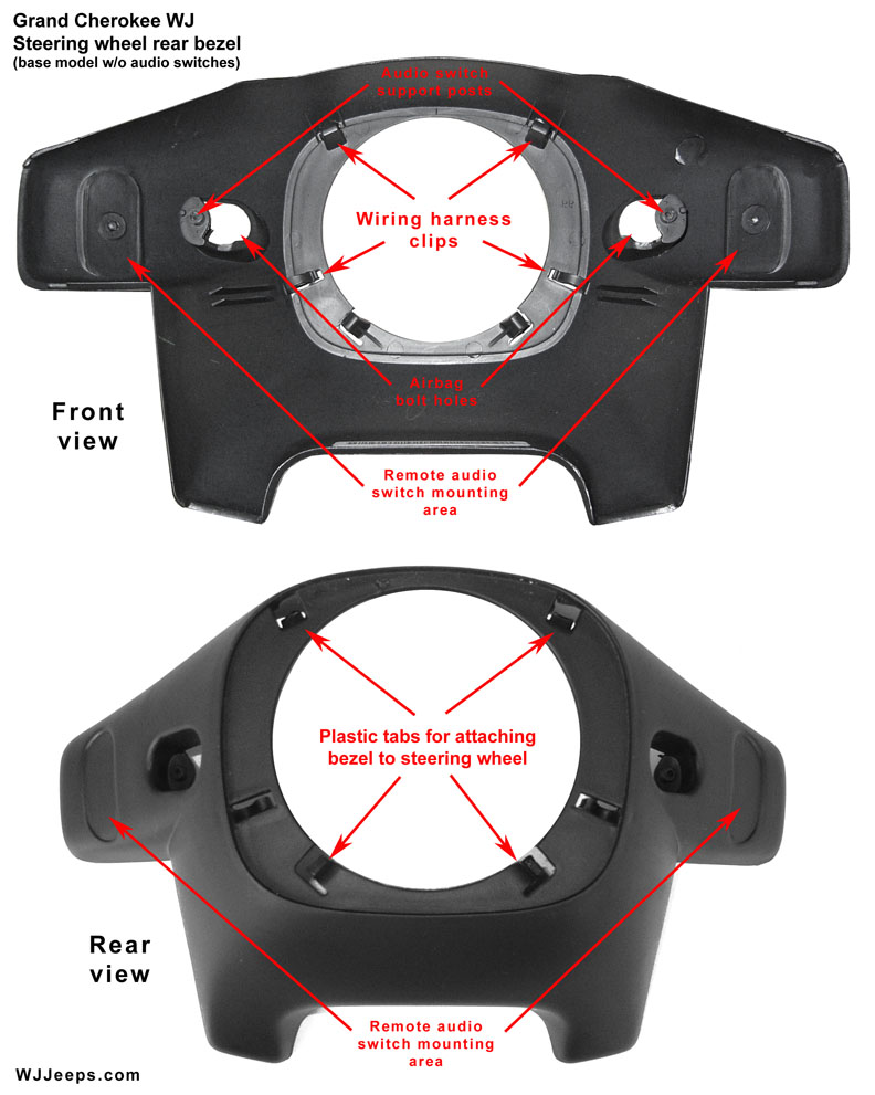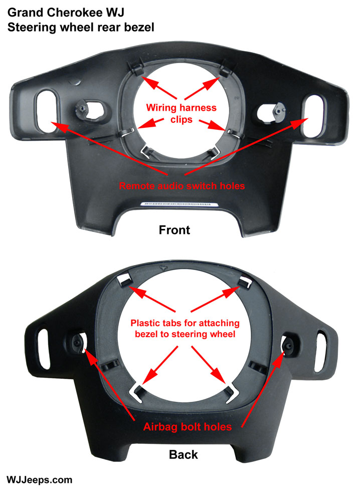 This method does not require removal of the steering wheel and uses the existing factory steering wheel bezel. The bezels for most (if not all) WJ's that come without the remote radio switch option have an indentation area marked where the switches mount. This area will need to be drilled out with a dremel or other cutting tool.