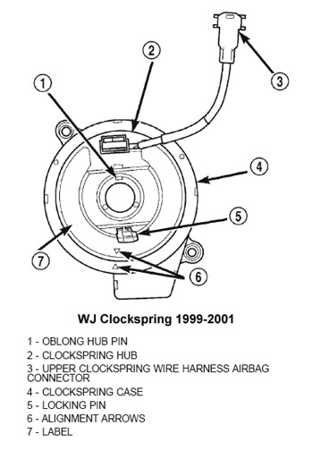wheel. On the Grand Cherokee WJ the rotating electrical components include the driver airbag, the horn switch, the speed control switches, and the remote radio switches, if the vehicle is so equipped. The clockspring case is positioned and secured to the multi-function switch mounting housing near the top of the steering column. The connector receptacles on the tail of the fixed clockspring case connects the clockspring to the vehicle electrical system through two take outs with connectors from the instrument panel wire harness.