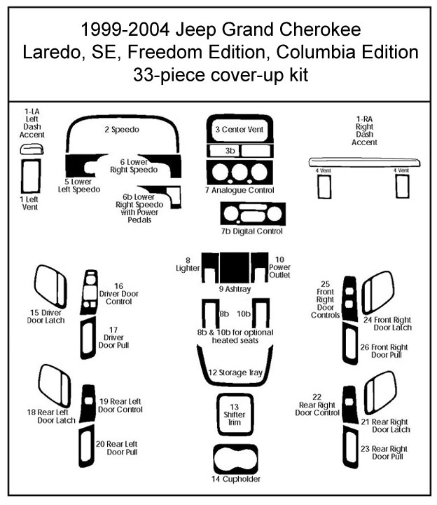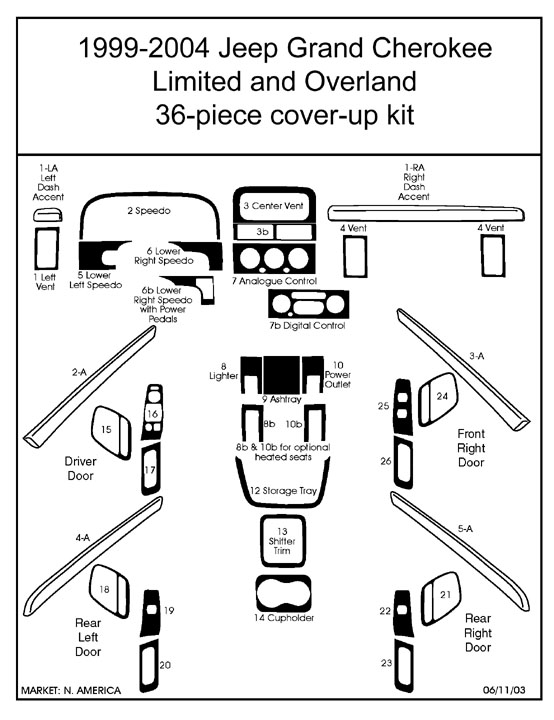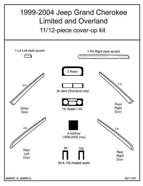 PRICE: ($U.S.)* (discontinued) 1. Laredo deluxe 33-piece "Cover-up kit": Available in all 13 colors/styles. $349.50 including shipping (Kit MSRP $535.00) 2. Limited deluxe 36-piece "Cover-up kit": Available in all 13 colors/styles. $379.50 including shipping (Kit MSRP $579.00) 3. Limited 2000-2004 English Burlwood 24/25-piece "Add-on" kit: $319.50 including UPS Ground shipping (continental U.S.). This kit is designed to be used for ADDING Burlwood trim to compliment the existing factory Burlwood trim featured on all 2000-2004 Limited models. Includes all of the trim pieces from the Burlwood full kit except for the pieces that are already included on Limited models from the factory. Standard delivery, 7-10 business days. Expedited delivery available (3-5 business days), inquire for price & provide zip code. 4. Limited/Overland 1999-2004 11/12-piece cover-up kit: Available in all 11 colors/styles. $265.00 including UPS Ground shipping (continental U.S.). This kit covers up just the original factory pieces, covering all of them with any of the 11 available colors/styles. Includes 4 door trim strips, 2 front dash strips, radio trim, digital AC control trim and heated seats (+ ashtray 1999-2002). Standard delivery, 7-10 business days. Expedited delivery available (3-5 business days), inquire for price & provide zip code. *Note: There was a $90 surcharge for Chrome colored kits